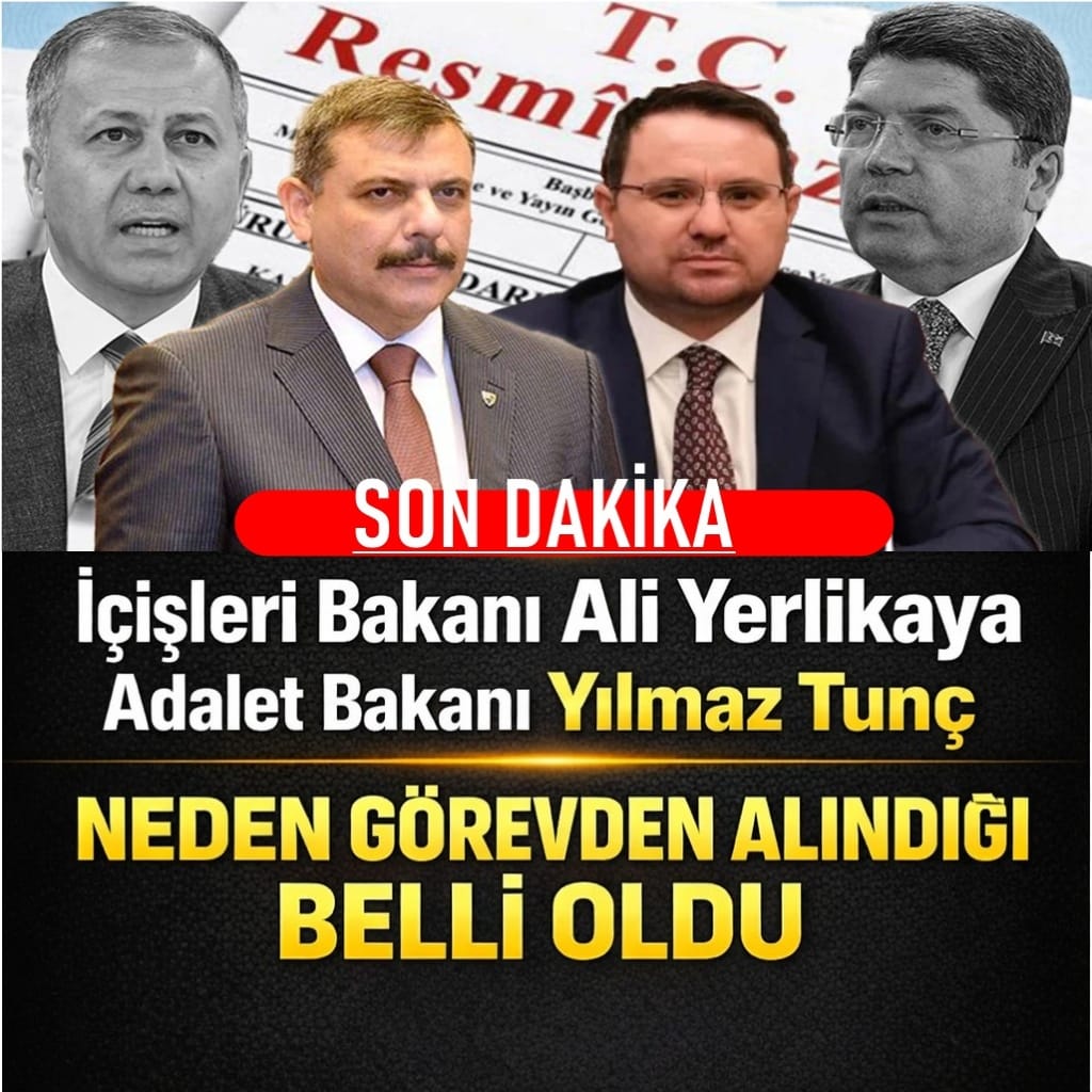 Cumhurbaşkanı Recep Tayyip Erdoğan’ın imzasıyla yayımlanan Resmi Gazete kararı ile İçişleri Bakanı Ali Yerlikaya görevinden alındı. Yerlikaya’nın yerine Erzurum Valisi Mustafa Çiftçi atandı.ALİ YERLİKAYA’DAN İLK AÇIKLAMAAtama kararlarının Resmi Gazete’de yayımlanmasının ardından Ali Yerlikaya’dan ilk açıklama geldi. Yerlikaya açıklamasında, “Ülkemizin huzur ve güvenliği için canla başla görev yapan İçişleri Ailemizin her bir ferdine ayrı ayrı yürekten teşekkür ediyorum” ifadelerini kullandı. Yerlikaya ayrıca Cumhurbaşkanı Recep Tayyip Erdoğan’a da şükranlarını sundu.”CUMHURBAŞKANIMIZA ŞÜKRANLARIMI ARZ EDİYORUM”Yerlikaya’nın açıklamasının tamamı şöyle: “Cumhurbaşkanımız Sayın Recep Tayyip Erdoğan’ın tensip ve takdirleriyle 4 Haziran 2023 tarihinde başladığım İçişleri Bakanlığı görevimi kıymetli kardeşim Mustafa Çiftçi’ye devrediyorum. Kendisini tebrik ediyor, yeni görevinde başarılar diliyorum. Allah hayırlı uğurlu etsin.Bakanlığım süresince verdiği büyük desteklerinden dolayı Sayın Cumhurbaşkanımıza şükranlarımı arz ediyorum.Ülkemizin huzur ve güvenliği için canla başla görev yapan İçişleri Ailemizin her bir ferdine ayrı ayrı yürekten teşekkür ediyorum. Allah’a emanet olun.”