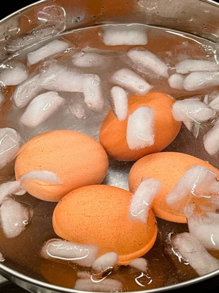 Haşlanmış yumurtayı buzlu su içerisinde tutun.