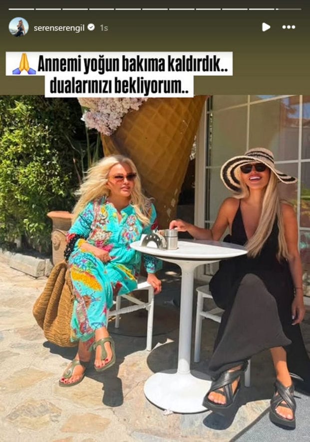 Seren Serengil, son paylaşımda; “Sayın Sağlık Bakanım, annemi kaybetme riskiyle karşı karşıyayım. Düşüp kalçasını kırdı, şimdi de kalp krizi tehdidiyle ve ciğerlerine su birikmesi nedeniyle yoğun bakıma alındı. Bulunduğumuz hastanede kalp ile ilgili yoğun bakım ve anjiyo ünitesi yok. İstanbul’a götürmem gerekiyor. Lütfen bana bir ambulans uçak gönderiniz; ücretini ödeyeceğim, ama lütfen yardım edin” ifadelerini kullandı.
